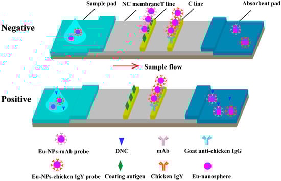 Coccidiosis is a widespread and economically significant livestock disease caused by protozoan parasites of the genus Eimeria []. Minor infections cause poor feed conversion and weight gain, whereas major infections can cause significant mortality []. Therefore, in addition to the diagnosis and treatment of animal diseases, strict biological prevention and control from the source are also necessary. Feed contaminated with mycotoxins may cause the release of toxic substances in edible tissues such as meat, fish, and dairy products [], seriously endangering human health and safety. Aflatoxin B1 (AFB1), the most toxic secondary metabolite produced by Aspergillus flavus, has become a major food safety issue worldwide due to its contamination of poultry feed []. In terms of biological prevention and control, the assessment of residual toxicity of multiple veterinary drugs in animal-derived foods based on endocrine disruptors using a high-throughput exposure (HTE) model [] and a risk assessment of low-dose dietary-related exposures concludes that a tolerable daily intake (TDI) is unlikely to have genotoxic effects leading to carcinogenicity [], to achieve the goal of ensuring human food safety and life health safety. Nicarbazin (NIC), an equimolecular mixture of 4,4-dinitrocarbanilide (DNC) and 2-hydroxy-4,6-dimethylpyrimidine, is a synthetic coccidiostat used globally to cure coccidiosis in animals, especially poultry. The widespread use of NIC causes its residues to be present in foods of animal origin, such as broiler tissues. Its residues can seriously affect the health of poultry and humans, such as by causing adverse heat stress and death in broilers and chronic toxicity in humans. Therefore, DNC is considered the residue of concern in edible chicken tissues []. The maximum residue limits (MRLs) for DNC in food matrices were established to assure food safety in poultry production. The Joint FAO/WHO Expert Committee on Food Additives in New Zealand and China has recommended an MRL of 200 μg of DNC/kg in all broiler tissues, and the EU recommended an MRL of 4000 μg of DNC/kg. Therefore, it is imperative to develop low-cost, sensitive, and effective methods for the detection of DNC in animal-derived foods. Multiple technologies have been applied to detect residues of DNC in food matrices. Instrumental methods, such as high-performance liquid chromatography (HPLC) [,,], high-performance liquid chromatography-tandem mass spectrometry (HPLC-MS/MS) [,,,], and ultraperformance liquid chromatography-tandem mass spectrometry (UPLC-MS/MS) [] are accurate and specific, but their experiments are complex and not suitable for on-site screening. Immunoassay, such as enzyme-linked immunosorbent assay (ELISA) [,,], has the advantages of high throughput screening but has significant limitations and is not suitable for on-site screening. Compared with the other methods, the immunochromatographic assay (ICA) is a more portable and faster assay []. Different types of fluorescent nanobeads, such as quantum dots [], fluorescent microspheres [], and up-conversion phosphors [], among them, time-resolved fluorescent nanoparticles have excellent fluorescence properties. Lanthanide labels possess long decay lifetimes, can be dissociated by altering the solution pH, resulting in a shift to a new highly fluorescent chelate, and have a large Stokes shift, high quantum yields, sharp emission profiles, and narrow emission peaks. Although the quantum yields are lower with the use of organic fluorescence dyes, packing them into nanosphere capsules can increase fluorescence thousands of times [,]. Therefore, these attributes enable time-resolved fluorescence immunochromatography (TRFICA) labeled with fluorescent microspheres to have higher sensitivity, lower matrix interference, and better reproducibility and stability.