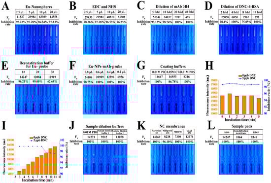 Optimization of TRFICA performance. (A) Use of EuNPs. (B) Use of EDC and NHS. (C) Dilution of mAb 3B4. (D) Dilution of DNC-4-BSA. (E) Reconstitution buffer for Eu-NP-mAb probes. (F) Use of Eu-NP-mAb probes. (G) Coating buffer. (H) Incubation time for the Eu probe and the DNC. (I) Incubation time for immunochromatography. (J) Sample dilution buffer. (K) NC membranes. (L) Sample pads.