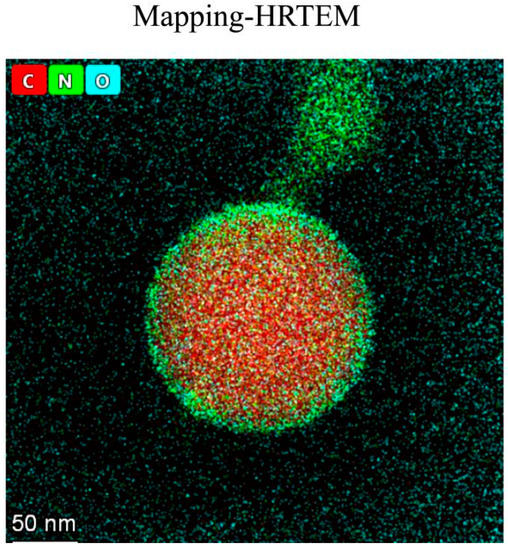 The Eu-NP-mAb probes were characterized by high-resolution transmission electron microscope studies. After coupling, the EuNP surface modified by the immobilized mAb was characterized by high-resolution transmission electron microscopy. The results validated the distribution of the elements on the surface of EuNPs attached to C, N, O, and other elements (Figure 4). The existence of the N element proved the successful coupling of EuNPs with mAb 3B4.