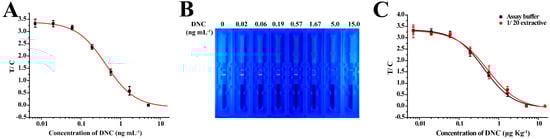 The standard curve of TRFICA in the buffer was established under optimized conditions. To evaluate the sensitivity of the method, the sensitivity of TRFICA was evaluated using the IC50, working range, and LOD. The LOD was examined and defined as the IC10 from the standard curve. According to curve fitting, the IC50, linear working range, LOD, and cut-off value of the method were 0.43 ng mL−1, 0.13–1.37 ng mL−1, 0.07 ng mL−1, and 5 ng mL−1, respectively (Figure 5A,B). These values represent a significantly improved performance relative to previous reports in which the LOD of the colloidal gold-based immunochromatographic test method was 0.86 ng mL−1. This indicates that TRFICA performed as an ultrasensitive detector of DNC.