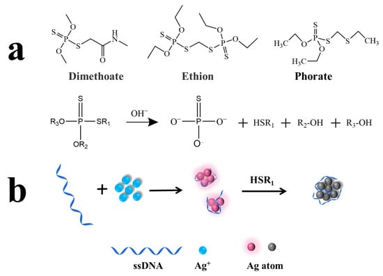 Today, fluorescence quenching sensing based on the interaction between sulfhydryl groups and fluorescent nanoclusters is quite common. Most of these methods achieved detection based on intrinsic sulfhydryl groups [16]. Meanwhile, hydrolysis of OPs can also produce sulfhydryl groups [17]. However, there are few reports of sulfhydryl groups hydrolyzed from OPs applied in fluorescence sensing. Therefore, inspired by the quenching effect of sulfhydryl groups on fluorescent nanoclusters, we achieved fluorescence sensing of three OPs based on quenching fluorescence of DNA-templated silver nanoclusters (DNA-Ag NCs) using a pesticide hydrolysate. Herein, we developed highly sensitive fluorescence detection methods for the three OPs (dimethoate, ethion and phorate) based on the quenching of fluorescence of DNA-templated silver nanoclusters (DNA-Ag NCs) by the pesticide hydrolysate under alkaline conditions for the detection of three OPs. It was found that the rapid hydrolysis of dimethoate, ethion and phorate under strong alkaline conditions could be utilized to split the P-S bonds of three OPs and produce the sulfhydryl group. Then, an indirect sensitive response of the DNA-Ag NCs to the OPs was achieved through the sulfhydryl group bonding with Ag NCs and the formation of Ag-S bond. Additionally, the other common OPs could not interfere with the detection. The above method has the advantages of enzyme-free, simple operation, high sensitivity and good selectivity, thus, showing high application potential in OP detection.