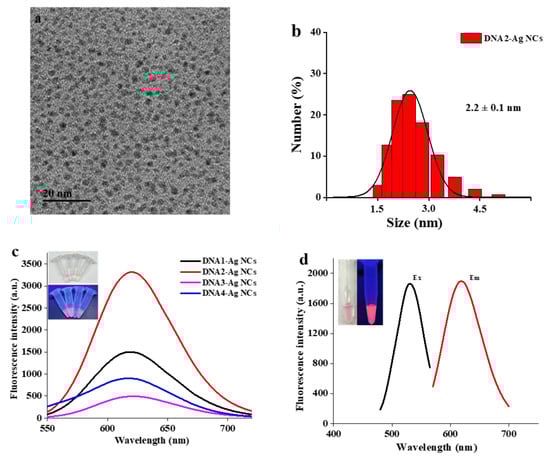 In order to confirm the formation of DNA2-Ag NCs, the particle size of the synthesized nanoclusters was characterized. As shown in Figure 2a, TEM was employed to characterize the size and morphology of DNA-Ag NCs. The synthesized DNA2-Ag NCs displayed no aggregation and the average particle size was about 1.76 nm. As Figure 2b presents, the average particle size was about 2.2 nm. Compared with the TEM image, the particle size obtained by DLS is slightly larger, because DLS measures the hydrated particle size. It can be seen that the as-prepared DNA2-Ag NCs had uniform particle size distribution and no large aggregate particles were created. For fluorescence performance, the fluorescence spectra showed that the maximum emission wavelength of the DNA2-Ag NCs was 620 nm with an excitation wavelength of 530 nm (Figure 2d). Meanwhile, as shown in Figure S3 (Supplementary Materials), the fluorescence intensity of DNA2-Ag NCs decreased by about 10% in 6 months, indicating that the fluorescence intensity of the DNA2-Ag NCs was stable. Figure S1 presents X-ray photoelectron spectroscopy (XPS) data for the synthesized DNA-Ag NCs. As shown in Figure 1b, binding energy peaks at 368.1 eV and 374.1 eV ascribed to Ag 3d5/2 and Ag 3d3/2 were consistent with the standard reference XPS spectrum of Ag [29,30]. Meanwhile, the binding energy peaks at 402.8 eV in the XPS spectrum of N 1s also indicated binding of Ag and N [31].