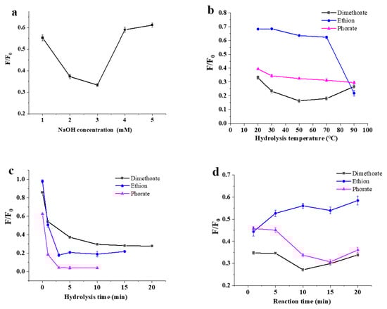 The alkaline environment was provided by an NaOH solution for the hydrolysis of OPs. Pesticides were mixed with the NaOH solution at different concentrations (1, 2, 3, 4 and 5 mM) and hydrolyzed. As displayed in Figure 3a, 3 mM was the optimal NaOH concentration in the hydrolysis of dimethoate, ethion and phorate for the next fluorescent determination. The result was due to the fact that that the low concentration of NaOH could not cause sufficient hydrolysis, while too much NaOH affected the fluorescence stability of the DNA2-Ag NCs. The temperature was an important factor affecting the hydrolysis rate in the alkaline hydrolysis of OPs. As shown in Figure 3b, the F/F0 response to the hydrolysis of phorate was demonstrated by a slow decrease in the temperature fluctuation of 20–90 °C. As for dimethoate, an optimal temperature of 50 °C could be found, although only small F/F0 variations could be observed. Additionally, the F/F0 response to ethion hydrolysate was demonstrated by a sharp decrease in the heating curve from 70 to 90 °C. When the temperature was set at 90 °C, the hydrolysis of the three pesticides was adequate or nearly adequate. Thus, this temperature was selected for the next experiments.