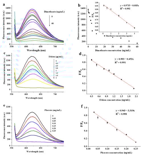 Fluorescence emission spectra of DNA2-Ag NCs at different concentrations of dimethoate (a), ethion (c) and phorate (e); the calibration plot of F/F0 versus concentration of dimethoate (b). Inset: corresponding linear ranges; corresponding calibration curves for ethion (d) and phorate (f) detection.