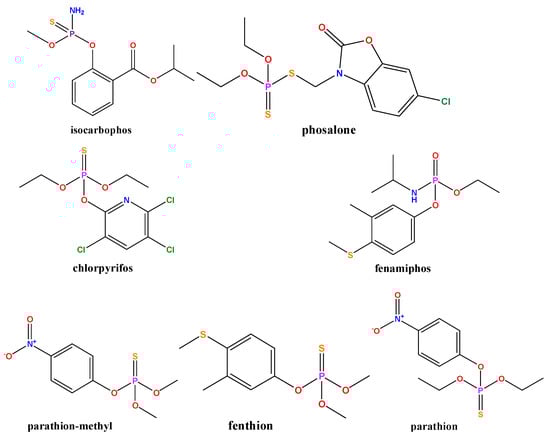 Organophosphorus pesticides (OPs) have been used for agricultural pest control worldwide for over half a century, and they contribute 38% of the total global pesticide use [1]. However, OP residues cause serious contamination of agricultural products and environmental pollution due to improper use, and also bring about harm to human health through food intake [2]. Organophosphorus compounds are characterized by the presence of the thiophosphoryl functional groups (P=S). Excessive use of OPs causes long-term accumulation in the ecosystem, which is harmful to the environment and human beings, because it can inhibit the activity of acetylcholinesterase (AChE), which is a kind of acetylcholinesterase hydrolase (ATCh). If the activity of AChE is inhibited, organisms become overexcited, eventually leading to death [3,4].