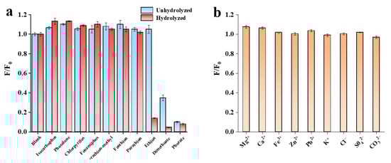 In order to evaluate the selectivity of the developed fluorescence sensor for target detection, another seven pesticides (isocarbophos, phosalone, chlorpyrifos, fenamiphos, parathion-methyl, fenthion, and parathion) were selected (Figure 6). Their structural formulae are shown in Figure 7a. Selectivity experiments were carried out under optimum conditions. The final concentrations of dimethoate, ethion and phorate were 2 µg/mL, five times lower than those of other interfering pesticides. As shown in Figure 7, these high concentrations of phosphate ester pesticides (fenamiphos), thiophosphate ester pesticides (isocarbophos, chlorpyrifos, parathion-methyl, fenthion, and parathion), and thioester phosphate pesticides (phosalone) did not respond to the DNA2-Ag NCs fluorescence system. Only three pesticide targets (dimethoate, ethion, and phorate) could cause fluorescence quenching. The response of DNA2-Ag NCs to dimethoate and ethion were greatly improved by hydrolysis under alkaline conditions. However, the hydrolysis of phorate only slightly enhanced its response. The reason could be due to the interaction between silver and sulfur also resulting in the breakage of the thioether bond in the phorate molecule, and the production of thiol [41]. Thus, the hydrolysis-based fluorescent detection had good selectivity for OPs containing P-bonds. We added some common anions and cations (100 μM) in the selective analysis experiment. As shown in Figure 7b, compared with the three OPs (2 µg/mL), a much higher concentration of interfering ions did not cause fluorescence quenching, indicating that the proposed method has good ion anti-interference ability.