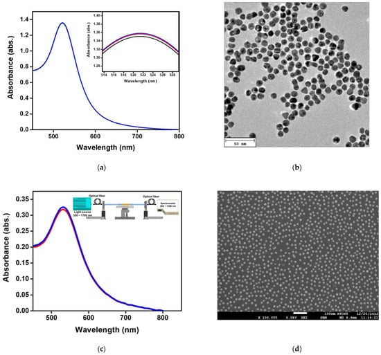 Structural characterizations of materials. (a) Absorption spectra of Au nanoparticles (AuNPs) in the aqueous medium in the visible region; (b) TEM image of AuNPs; (c) a fiber optic spectrometer was used to measure the absorption spectrum of AuNPs on the surface of the probe in the visible region in the aqueous medium; (d) FESEM image of AuNPs on the fiber core surface. The test was repeated three times for each data point (n = 3), and the data were represented by an average value and standard deviation (average value ± standard deviation).