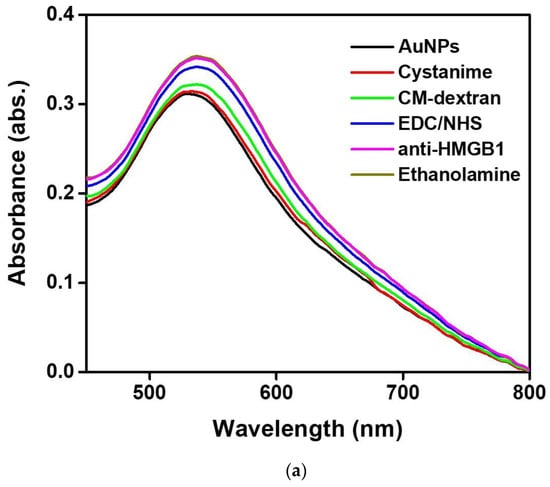 (a) Gradual functionalization of AuNP, cystamine, CM-dextran/EDC/NHS, EDC/NHS, anti-HMGB1, and ethanolamine in the probe modification spectrogram (measured in the PBS buffer); (b) EDS measurement verification.