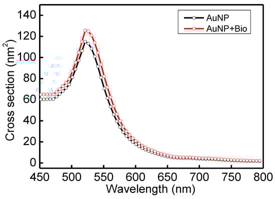 In order to understand the optical properties of biomolecules interacting with nanoparticles, this study used discrete dipole approximation (DDA) to simplify that model and simulate nanoparticle surface modification biomolecules’ extinction spectrum [59]. It can be used to design a real-time light intensity detection system. The simulation structure and parameters are shown in Figure 6a and Table 1. The simulation wavelength range is 450–800 nm. The simulation structure contained a circular AuNP with a size of 13 nm (reference Figure 4b TEM image). The refractive index (Nmetal = n + ik) had real part n and imaginary part k [60]. Biomolecules were adsorbed on the circular AuNP surface. Biomolecules consist of three spheres with a radius and refractive index of 3.2 nm and 1.45, respectively. Their size is about a 13 nm Y-shaped structure, as shown in Figure 6b. The external environment was a phosphate-buffered saline (PBS buffer) with a refractive index of 1.42. The results of the extinction spectrum of nanoparticle surface modification biomolecules simulated by DDA are shown in Figure 7. The LSPR peak wavelength changes were not apparent before and after the AuNP surface modification of biomolecules. Additionally, the extinction cross-section increased from 108.3 nm2 to 120.9 nm2 at the wavelength of 530 nm with a variable rate of about 11.1%. It shows that it is easier to observe the change of light intensity as the indicator of biosensor analysis than the wavelength shift. Based on the experimental results, the before (at 530 nm, Figure 5 black line AuNPs) and after (Figure 5 purple line anti-HMGB1) absorbance was 0.31028 and 0.35317, respectively. The AuNPs surface was modified with biomolecules. With an increased absorbance, the light intensity decreased after the AuNPs surface was modified with biomolecules. The light intensity variation rate was 9.4% (10−0.31028 − 10−0.35317/10−0.31028), meaning the biomolecules modified the AuNPs surface. This finding matched the trend of simulation results. It is also the reference for choosing the wavelength of 530 nm as the light source for the FOLSPR biosensor system in this study.