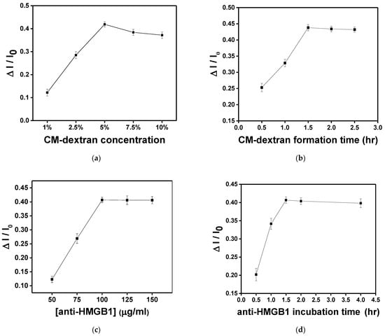 In this study, the sensing chip formed surface functionalization through chemical bonding reactions. In each experiment, 10−8 g/mL HMGB1 was injected for 15 min of molecular binding to obtain the signal response. First, the AuNP-cystamine surface was modified individually with 1%, 2.5%, 5%, 7.5%, and 10% (weight%) CM-dextran solution. As shown in Figure 8a, the increase is apparent when the concentration was 1%, 2.5%, and 5%. When the concentration was 5%, the response of HMGB1 was the largest (ΔI/I0 = 0.419 ± 0.011). Signals gradually decreased after 7.5% and 10%. This is because the viscous CM-dextran solution resulted in steric hindrance. Therefore, the concentration of CM-dextran was set at 5% for subsequent experiments. The CM-dextran immobilization time was 0.5, 1, 1.5, 2, and 2.5 h. It was observed that the immobilization gradually reached saturation in 1.5 h (Figure 8b). Therefore, the subsequent work used 1.5 h as the CM-dextran formation time. The AuNP-cystamine-CM-dextran was formed on the surface of the probe, and the unbonded CM-dextran was removed by ionized water. Afterward, the -COOH functional group on the surface of CM-dextran was activated using the mixed liquor of EDC (0.2 M) and NHS (0.05 M) for an amine coupling reaction with activation times of 20 min. At this time, 50 μL anti-HMGB1 (50, 75, 100, 125, and 150 μg/mL) was injected to influence the signal response by antibody modification. It was observed that when the concentration of anti-HMGB1 was 100 μg/mL, the signal response was the highest (Figure 8c). Then, the signal response became smooth. Therefore, the concentration of anti-HMGB1 was set as 100 μg/mL for subsequent experiments. The incubation time of anti-HMGB1 (0.5, 1, 1.5, 2, and 4 h) was closely related to the stability of the chemical covalence of recognition molecules. Different from the traditional monolayer, CM-dextran had multiple binding points. It was observed that the signal response exhibited the maximum signal decline at 1.5 h and then presented a smooth trend (Figure 8d). Therefore, the anti-HMGB1 incubation time was 1.5 h in subsequent experiments.