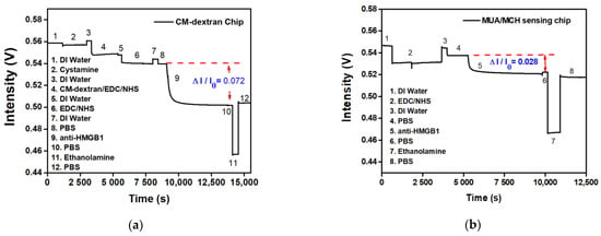 The signal responses of anti-HMGB1 modified by different bridging molecules were compared. The experiment used two surface modification methods: (a) fixing by CM-dextran, and (b) fixing by MUA/MCH. Afterward, the -COOH on CM-dextran or MUA was activated by EDC/NHS, which bonded with amines on anti-HMGB1 to modify the surface of the optical fiber probe. A PBS buffer washed out the uncombined anti-HMGB1. To inactivate the unreacted -COO-, 1 M aqueous ethanolamine solution of pH 8.5 was used for washing. The signal response at each stage was evident in the real-time signal graph. It indirectly proves the steps of antibody immobilization on the AuNP surface or the antibody-analyte interactions. The difference in signal responses between the two sensing chips when anti-HMGB1 was applied could be seen from the real-time signal change in Figure 8a,b. The CM-dextran sensing chip developed in this study had relatively abundant surface bonding points. The molecular bonding of the carboxyl group on anti-HMGB1 and CM-dextran was relatively reduced in the overall signal (ΔI/I0) to 0.072 (Figure 9a). However, the MUA/MCH sensing chip was a mixed monolayer, and the molecules were arranged mainly by the Van der Waals force. The steric hindrance was formed in the arrangement process, leading to fewer bonding points. It was observed that the overall relative signal reduction (ΔI/I0) is 0.028 when modifying anti-HMGB1 (Figure 9b). This indicates that the relative signalization of the CM-dextran sensing chip was 2.57 times that of the MUA/MCH sensing chip with modifying the recognition molecules.