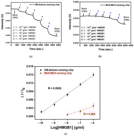 (a) The anti-HMGB1 functionalized CM-dextran sensing chip signal with the injection of different HMGB1 concentrations of (1) 1.0 × 10−10, (2) 1.0 × 10−9, (3) 1.0 × 10−8, (4) 1.0 × 10−7, and (5) 1.0 × 10−6 g/mL. (b) The anti-HMGB1-functionalized MUA/MCH sensing chip with the injection of different HMGB1 concentrations of (1) 1.0 × 10−10, (2) 1.0 × 10−9, (3) 1.0 × 10−8, (4) 1.0 × 10−7, and (5) 1.0 × 10−6 g/mL. (c) Calibration curve for HMGB1 by CM-dextran and MUA/MCH sensing chip in FOLSPR biosensor. Each point is the mean of three repeated measurements.