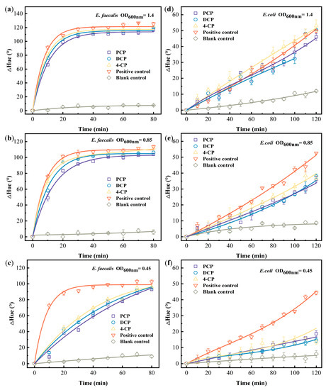 Incubated with 10 mg/L PCP, the growth of Gram-positive E. faecalis was obviously affected (Figure 4a), indicating that the bacteria cannot grow. However, 10 mg/L of 2,4-DCP and 4-CP did not show an effect on the growth of E. faecalis. The traditional absorbance measurements cannot completely differentiate the toxicity of 10 mg/L PCP, 2,4-DCP, and 4-CP. Meanwhile, by the PADs developed in this present study, the inhibition of 10 mg/L PCP, 2,4-DCP, and 4-CP can be differentiated in 30 min.