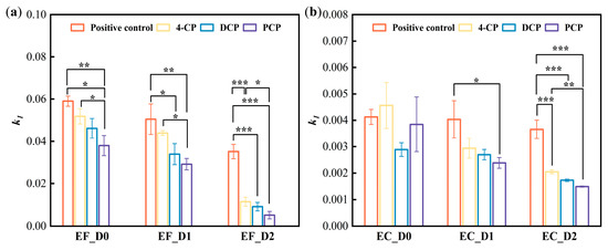 The simulated k1 values based on Figure 2 are summarized in Table 1. E. faecalis density at OD600nm 1.4 and 0.85 had the k1 value of 0.059 and 0.050 min−1, respectively. Although these two densities were different, the amount of bacteria in the culture medium remained in the same order of magnitude (~108), resulting in nonsignificant resazurin reduction kinetics difference between them. When the bacterial culture was further diluted (four times) to achieve density at OD600nm 0.45, the resazurin reduction kinetics significantly slowed down (k1 at 0.035 min−1). The same phenomenon manifested in both the control and chlorophenol-treated groups (Figure 2a–c), whose statistical analysis results are shown in Figure 3a. Although the addition of chlorophenols impacted E. faecalis and its reducing resazurin on PAD at densities of 1.4 and 0.85, it was unable to identify chlorophenols’ toxicity difference. Meanwhile, when E. faecalis density was at 0.45, according to the fitted k1 value in Table 1 and statistical analysis in Figure 3a, the toxicity of the three chlorophenols could be sorted as PCP > 2,4-DCP > 4-CP, which was closely correlated with the number of substituted chlorine atoms [35] and the same as the toxicity sequence of various chlorophenols [36]. Hence, OD600nm 0.45 was recommended as E. faecalis density for further study.