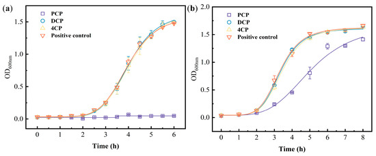 The growth curve of E. faecalis (a) and E. coli (b) under the stress of chlorophenols (conventional growth inhibition assay); the growth curves were obtained by logistic fitting.