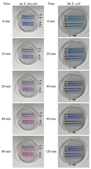 The pictures captured in the recorded video to illustrate the color change in reducing resazurin by E. faecalis and E. coli (Figure 1). The difference in hue values every ten 10 from those at 0 min were fitted in conjunction with Equation (1) (Figure 2). Table 1 summarizes the simulation results (k1 and k2). The majority of E. faecalis fitting results were more than 0.9 (>0.636, critical R2 under p = 0.01). In general, the fitting outcomes for E. coli were higher than 0.9, which is higher than 0.467 (critical R2 under p = 0.01). These results suggest that the model (Equation (1)) can reasonably be used to simulate the reduction process of resazurin on PADs for two different strains of bacteria, E. faecalis and E. coli.