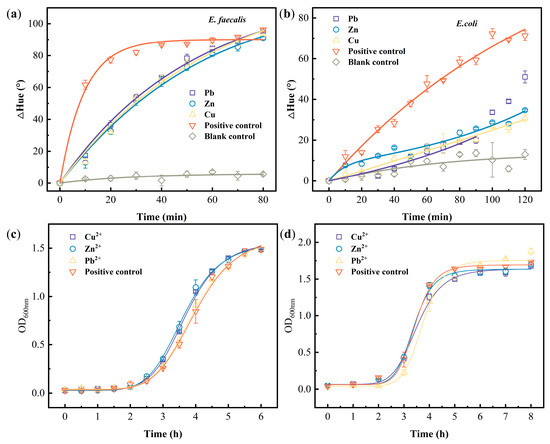 Color kinetic curve and growth curve of heavy metal ions on the growth of E. faecalis and E. coli. (a) Color kinetic change of the E. faecalis-PAD, (b) color kinetic change of the E. coli -PAD (data from 100–120 min for Pb in (b) were not included in the fitting process), (c) the conventional growth curve of E. faecalis under the stress of metal ions. (d) The traditional growth curve of E. coli under the stress of metal ions.