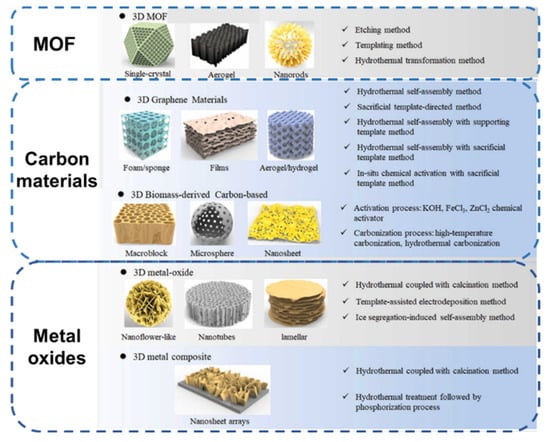 3D electrode materials with high-dimensional structures have larger specific surface areas and more active reaction sites than 0, 1, and 2-dimensional materials. Moreover, the electrode’s 3D structure maximizes space utilization, minimizes “dead surfaces,” and guarantees enough porous channels in the laminate structure. Therefore, electrochemical sensors based on 3D structured electrodes have garnered much attention due to their great sensitivity and outstanding selectivity. Typical 3D materials comprise MOFs, carbon material and metal oxides, as shown in Figure 2.