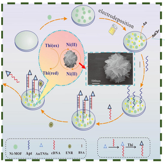 - Lv, L.; Zhang, B.; Tian, P.; Xie, L.; Wei, W.; He, J.; Lin, M.; Zhu, H.; Chen, H.; He, B. A “signal off” aptasensor based on AuNPs/Ni-MOF substrate-free catalyzed for detection Enrofloxacin. J. Electroanal. Chem. 2022, 911, 116251. [Google Scholar] [CrossRef]