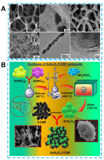 (A) Scanning electron microscopy images of 3D graphene and 3D graphene/Co3O4 composites at different magnifications and high-resolution transmission electron microscopy images. Reprinted from [103] with permission from the American Chemical Society. (B) Schematic diagram of synthetic SrAl2O4/f-CNF. Reprinted from [114] with permission from Elsevier.