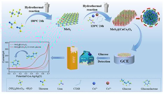 - Wang, H.; Zhu, W.; Xu, T.; Zhang, Y.; Tian, Y.; Liu, X.; Wang, J.; Ma, M. An integrated nanoflower-like MoS2@CuCo2O4 heterostructure for boosting electrochemical glucose sensing in beverage. Food Chem. 2022, 396, 133630. [Google Scholar] [CrossRef]