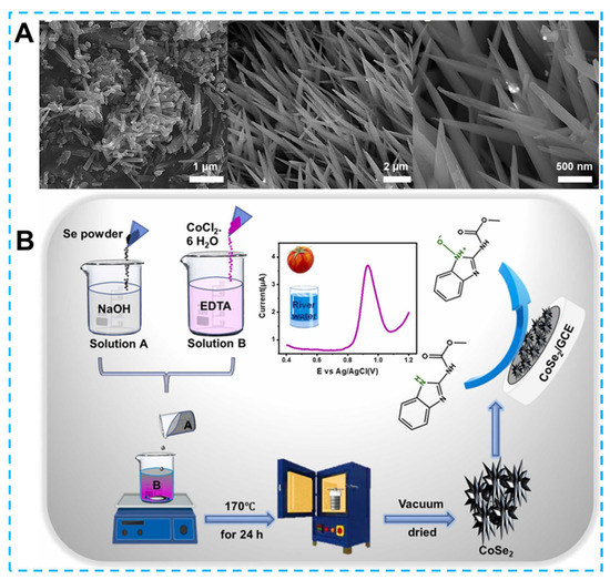 (A) Scanning electron micrograph of the typical 3D nanograss-like structures and (B) schematic diagram of 3D sea urchin-like o-CoSe2 synthesis. Reprinted from [159,160] with permission from Elsevier.