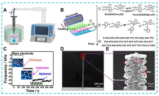 Developing emerging technologies for the electrochemical detection of bacteria could significantly reduce foodborne illnesses caused by bacterial contaminants. For example, Feng et al. prepared an electrochemical immunosensor based on Fe3O4@graphene composites to detect Salmonella in milk [167]. The 3D complex could immobilize monoclonal antibodies by loading a large amount of Au-NH bonds due to the growth of almost spherical Fe3O4 on a 2D graphene substrate, and Au NPs that also provided Au-NH could amplify an electrical signal. Electrochemical detection of Salmonella by these 3D composites was performed within the range of 2.4 × 102 and 2.4 × 107 cfu/mL with the detection limit of 2.4 × 102 cfu/mL. In addition, composite 3d materials containing graphene have shown high sensitivity in electrochemical sensing without immunoreactivity. For example, Fatema et al. focused on designing materials to prepare and apply Cu-Sn codoped BaTiO3-G-SiO2 (CuSnBTGS) to detect Rhizoctonia stolonifer [168]. CuSnBTGS had many mesopores and an ideal surface area, which N2 adsorption—desorption isotherms had confirmed was due to its mixed cubic sphere and lamellae structure. The rapid migration of electrons on the CuSnBTGS surface also resulted in a linear relationship between the sensing Rhizoctonia stolonifer concentration in the range of 50–100 μL, and the detection limit was 0.50 μL. Along with synthesizing 3D structured nanomaterials, designing 3-dimensional microstructured electrodes can also optimize the detection effect. As an example of a typical optimized planar electrode shown in Figure 10, Lai et al. created Ag micro-nano-pillars that resembled multilayer cakes using local electrochemical deposition [169]. The uneven surface of these nano-pillars formed a localized electric solid field that caused Cl− ions within the bacteria to flow out. And the Cl− ions were used to label bacteria in the pseudo-capacitive electrochemical sensor constructed using Ag micro-nano-pillars. Compared to flat structures and smooth Ag columns, Ag micro-nano-pillars with rough surfaces was more capable of inducing Cl− ions, as confirmed by COMSOL simulations. Therefore, the sensor achieves ultra-sensitive detection for Staphylococcus aureus in the linear range of 1–105 CFU mL−1 with a detection limit as low as1 CFU mL−1 and maintains specificity in the presence of nine other species of bacteria. In addition to the traditional colony count, detecting biomarkers is an essential indicator of bacterial viability and damage. Zheng et al. used hydrangea-shaped MoS2 modified by AuPd nanoparticles to design electrochemical aptamer sensors [170]. Meanwhile, porous Co-MOF and MCA 3D hybrid materials offer a clearly defined structure and reliable electrochemical characteristics. In particular, the structural advantage of a large specific surface area provides many sites for methylene blue (MB) loading. More active surfaces also offer the potential to penetrate many nucleotide chains driven by π–π stacking interaction and electrostatic adsorption interaction. Based on the above advantages, electrochemical aptasensors were developed to detect adenosine triphosphate (ATP) biomarkers. With reasonable use of the 3D structure of the active material and the signal label, not only is signal amplification achieved, but the detection range of 10 pM–100 μM and detection limits as low as 7.37 × 10−10 μM are the ideal embodiment of performance.
