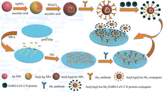 In this study, an SPR biosensing platform based on the Au-MEA-GOs/Ab1 sensing film and combined with Au@Ag@Au/Ab2 sandwich method was constructed for the detection of SARS-CoV-2 N protein (Figure 1). First at all, gold nanoparticles were obtained by reducing chloroauric acid with sodium citrate. Secondly, the silver shell layer was formed on the surface of the gold nanospheres making use of the reduction of silver nitrate by ascorbic acid; in order to protect the silver nanoparticles from oxidation, Au@Ag@Au NPs with a core–shell structure were formed on the surface by the reduction of chloroauric acid using ascorbic acid. It has been shown that Au@Ag@Au NPs are capable of forming Au@Ag@Au/Ab2 complexes by coupling with antibody Ab2 at pH 8.0 at room temperature [38]. The Au@Ag@Au/Ab2 complex was bound to the SARS-CoV-2 N protein for further use. The clean new gold chip was modified with amino groups by immersion to make the gold chip positively charged; the gold chip was modified with graphene oxide through electrostatic interactions, and antibody Ab1 was immobilized on the surface of the gold chip through the amide bonds formed by the abundant carboxyl groups on the surface of graphene oxide and the amino groups on antibody Ab1. The gold chip modified with antibody Ab1 was then fixed onto the SPR prism through the sample chamber and injected with Au@Ag@Au/Ab2 complexes conjugated to the SARS-CoV-2 N protein for sensing detection.