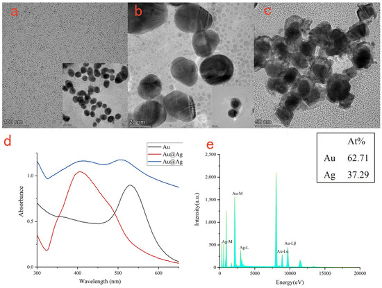TEM picture of Au NPs (a); TEM picture of Au@Ag NPs (b); TEM picture of Au@Ag@Au NPs (c); the UV-vis absorption spectra of Au NPs, Au@Ag NPs, Au@Ag@Au NPs (d); the EDS spectra of Au@Ag@Au NPs (e).