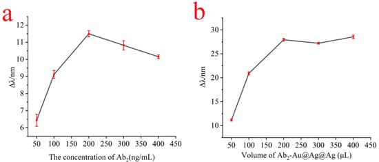 The Au@Ag@Au NPs were coupled to the antibody Ab2 to form a signal amplification probe at pH 8.0. In particular, the concentration of antibody Ab2 modification on Au@Ag@Au NPs composites was critical to whether the Au@Ag@Au NPs composites were effective in enhancing the sensitivity of SPR sensors. Too low of a concentration of antibody Ab2 would lead to inability to detect high concentrations of the sample to be tested, and too high of a concentration of antibody Ab2 would lead to antibody waste. Therefore, in order to estimate the immobilization amount of antibody Ab2 to couple on the surface of Au@Ag@Au NPs, the immobilized amount of Ab2 was quantitatively estimated according to the absorbance of the Ab2 solution after incubation. As shown in Table S1, it was obviously observed that the absorbance increased gradually, indicating antibody Ab2 coupled at Au@Ag@Au NPs surface up to saturated when the concentration of antibody Ab2 was greater than 200 ng/mL. Therefore, 200 ng/mL was chosen as the ideal concentration. At the same time, the relationship between the variation in resonance wavelength and the concentration of antibody Ab2 was established. As shown in Figure 3a, when the antibody Ab2 concentration was in the range of 50 ng/mL to 200 ng/mL, the amount of change in resonance wavelength increased with the increase in antibody Ab2 concentration; when the antibody Ab2 concentration was 200 ng/mL, the binding sites on the surface of Au@Ag@Au NPs were almost completely occupied by antibody Ab2, and the maximum response signal for SPR detection was obtained, which was reflected by the maximum resonance shift of 11.5 nm. When the concentration of antibody Ab2 continued to increase, it led to an increase in spatial site resistance, which in turn led to a decrease in the amount of SPR resonance shift change. Taking into account the consumption of the antibody, the optimal amount of antibody Ab2 to be used was 200 ng/mL.