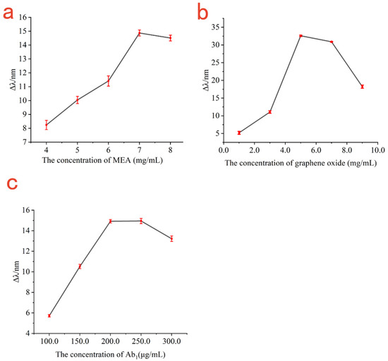 The relationship curve between the shift in resonance wavelength and the concentration of MEA (a); the relationship between the shift in resonance wavelength and the concentration of graphene oxide (b); the relationship between the shift in resonance wavelength and the concentration of antibody Ab1 (c).
