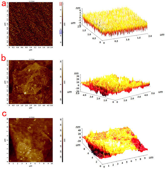 The AFM picture of the bare film (a); the AFM picture of the GO immobilized on the surface of the chip (b); the AFM picture of Ab1−GO binding to the surface of the chip (c).