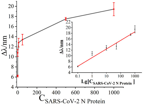 To evaluate the sensitivity of the SPR biosensor, various concentrations of SARS-CoV-2 N protein were tested under the optimal detection conditions. As shown in Figure 6, the changes in resonance wavelength gradually increased with the increase in concentration of SARS-CoV-2 N protein. When the concentration of SARS-CoV-2 N protein was 0.1 ng/mL, the minimum resonance wavelength shifts was about 6.19 nm. Similarly, when the concentration of SARS-CoV-2 N protein was 1000 ng/mL, the maximum resonance wavelength shifts was about 19.44 nm. A linear relationship was observed between the amount of change in resonance wavelength and Lg [CSARS-CoV-2 N protein]. Additionally, there was good linearity in the range of 0.1 ng/mL~1000 ng/mL. Based on the theory of S/N ≥ 3, the limit of detection (LOD) was calculated as approximately 0.083 ng/mL (LOD = 3 × standard deviation/slope).