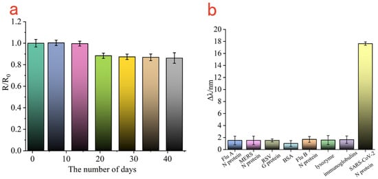To evaluate the storage stability of the Au-MEA-GO/Ab1 modified sensing film, the prepared gold chips modified with Au/MEA/GO/Ab1 were immersed in PBS buffer and stored at 4 °C. 500 ng/mL SARS-CoV-2 N protein was tested every 7 days and the amount of change in the resonance curve was recorded. The change in the SPR resonance curve detected on the first day was recorded as R0, and the change in the SPR resonance curve on the next 6 days was recorded as R. Therefore, the relationship between R/R0 and the number of days was established. As shown in Figure 7a, all SPR response values were above 85% within 42 days, indicating the good stability of this sensing gold chip.