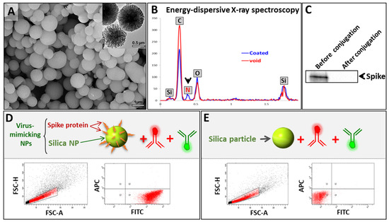 Characterization of virus-mimicking silica particles (VM-SPs). (A) SEM and TEM images show uniform average sizes of ~0.5–1 µm. (B) EDX spectroscopy showing the chemical composition of naked and spike-protein-coated SPs. SPs showed an extra peak corresponding to the nitrogen element which indicates the successful attachment of the spike protein on their surface. (C) Western blotting analysis was used to quantify the spike protein in the reaction supernatant before and after conjugation. After conjugation, the spike protein was not detected in the supernatant, indicating complete protein conjugation. (D) Flow cytometry analysis of VM-SPs using an FITC-labeled anti-spike protein clearly showed that almost all SPs were FITC-positive (coated with spike protein). A non-specific APC-labeled antibody was also used as a negative control. (E) To eliminate any possible non-specific binding of the FITC-anti-spike antibody to SPs directly, we used this antibody to stain the naked SPs. The results showed that all events were negative.