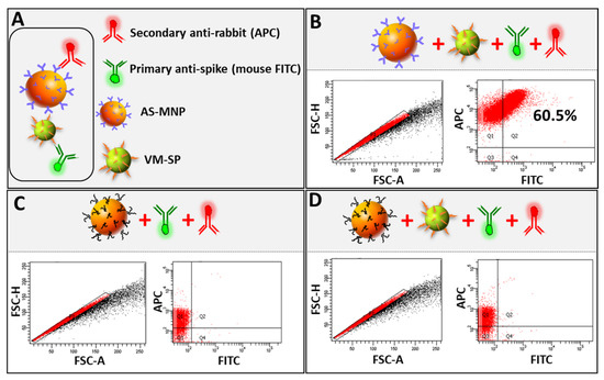 For the detection of captured viral particles, the complex virus/AS-MNPs was stained with a combination of two antibodies: (i) FITC-labeled monoclonal anti-spike antibody, and (ii) a secondary anti-rabbit APC-labeled antibody specific to AS-MNPs (Figure 1B). After the staining step, the AS-MNPs were analyzed via flow cytometry: the detection of double-positive events indicates virus/AS-MNPs complex formation, which demonstrates the presence of a target virus in the analyzed sample. In the case of a viral-free sample, AS-MNPs will only be APC-positive (Figure 1B).