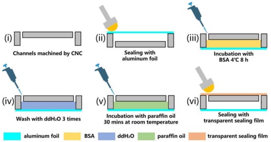 Flowchart of fabrication of chip: (i) channels machined using CNC; (ii) sealing with aluminum foil; (iii) incubation with BSA 4 °C 8 h; (iv) wash with ddH2O; (v) incubation with paraffin oil for 30 min at room temperature (20 °C–25 °C); (vi) sealing with transparent sealing film.