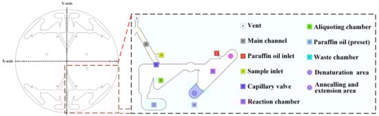 The chip was designed using the SolidWorks software (2016 SP04) for three-dimensional structural drawing. As the channels were single-layer structures, they were etched using CNC and drilled. Considering the heat deflection temperature and light transmittance requirements, polycarbonate was chosen as the chip material. An aluminum foil sealing film (YA0240-S, Solarbio, Beijing, China) was used for sealing the side of the etched channel, and a roller was used for flattening and tightening. The surface treatments included BSA coating and paraffin oil lubrication. BSA (A8020; Solarbio, Beijing, China), at a concentration of 1 mg/mL, was added to fill the chip. Then, the chip was incubated at 4 °C for 8 h. After incubation, the chips were drained by shaking. The chip channel was then washed thrice using ddH2O. After emptying, the reaction chamber was filled with paraffin oil (B500301, Sangon, Shanghai, China) through the paraffin oil inlet and incubated for 30 min. A pipette was used to drain as much paraffin oil as possible through the channels. The small amount of residue did not affect the amplification process. Small pieces of a transparent sealing film were used to seal the paraffin oil inlet. The four regions of the chip were handled similarly. A flowchart of the chip fabrication process is shown in Figure 1. The diagram of the different parts (areas) of the chip is shown in Figure 2.