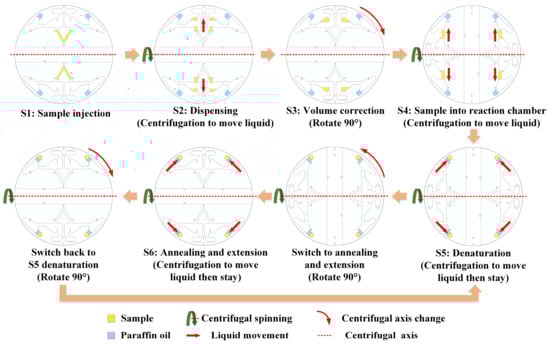 S6: Annealing and extension: After the centrifugal axis was changed, the chip was centrifuged, and the PCR reaction sample with paraffin oil was moved to the annealing and extension areas and cooled to the temperature required for annealing and extension for a certain time. After annealing and extension, the stepper motor rotated the chip 90° to change the centrifugal axis changed and then returned to S5 as a cycle.