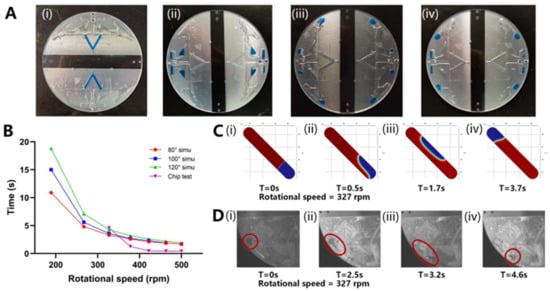 Through a simulation, we preliminarily confirmed the relationship between the centrifugal speed, the contact angle of the chip material, and liquid movement time, as shown in Figure 4A. The simulated liquid movement is shown in Figure 4B,C. When the centrifugal speed was lower than 327 rpm, the contact angle of the material influenced the speed of the liquid movement. When the centrifugal speed was higher than 327 rpm, the difference in the time of liquid movement was within 1 s. As the centrifugal speed increased, the liquid movement time continuously decreased, and when the centrifugal speed was higher than 422 rpm, the time for liquid movement was less than 2 s.