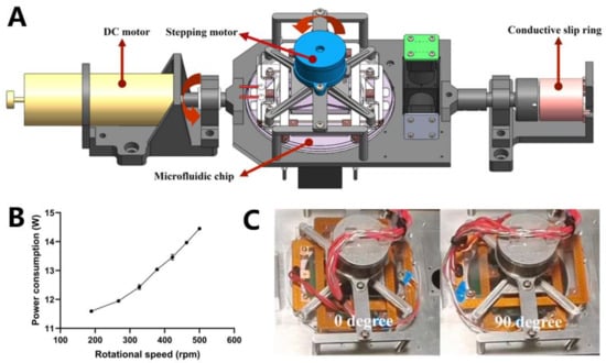 After completing assembly, the device was tested for operation at 189–500 rpm. The tests were conducted at 0° and 90°, as shown in Figure 5C. The device operated stably at the test speeds. The motor power at different speeds was measured using a power meter, as shown in Figure 5B. The motor power gradually increased with increasing speed. Considering the liquid movement results described in Figure 4B, the device used a centrifugal speed of 422 rpm for the two axial centrifuges.