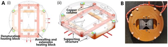 Two independent copper blocks were used to provide constant-temperature zones for denaturation and annealing. Each copper block was rectangular with four columns. The two copper blocks were fixed on the polyimide structures, and the tops of the columns were placed on the same plane to hold the chip. Heating films were used as the heat source and placed at the bottom of the copper block using a PT1000 temperature sensor. The circuit system collects temperature data and controls the output power of the heating film using a PID feedback algorithm for temperature control. The structural design is shown in Figure 6A. A photograph of the thermal structure is presented in Figure 6B.