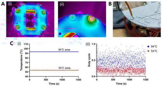 (A) The temperature distribution was captured with a thermal imaging camera and displayed using software; (i) Temperature distribution over the entire thermal structure; (ii) Temperature distribution of a set of 94 °C and 54 °C. (B) Photo of ramp rate measurement in the chip. (C) (i) The constant temperature curve of two areas. (ii) The duty cycle curve of two areas.