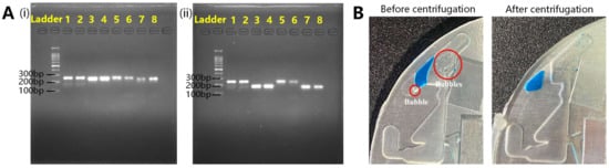 (A) The gel electrophoresis results of PCR verification. (i) Lanes 1 and 2 are the yhaI results on conventional PCR device; lanes 3 and 4 are the arcC results on conventional PCR device; lanes 5 and 6 are yhaI results on chip; lanes 7 and 8 are arcC results on chip. (ii) Lanes 1 and 2 are yhaI results on a conventional PCR device; lanes 3 and 4 are PEX-2 results on a conventional PCR device; lanes 5 and 6 are yhaI results on a chip; lanes 7 and 8 are PEX-2 results on a chip. (B) Photo of bubble removal before and after centrifugation.