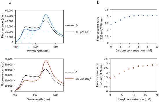 The affinity of biosensor 1 for calcium and uranyl was tested by measuring the fluorescence transfer between the two FPs. Iminodiacetate (IDA) was added to the protein solution to prevent precipitation of free uranyl, as previously described [23]. A basal level of FRET was observed in the absence of metal, as evidenced by the two fluorescence maxima observed at 476 nm and 525 nm (Figure 2a). Then, a decrease in fluorescence at 476 nm and a concomitant increase in fluorescence at 525 nm were observed following cation binding (calcium or uranyl) due to fluorescence transfer between both FPs (Figure 2a). This biosensor, inspired by the one previously developed for calcium, responds not only to calcium but also to uranyl, as shown in Figure 2. The maximum of FRET was obtained in the presence of ≥ 5 µM of calcium nitrate and ≥ 10 µM of uranyl nitrate (Figure 2b).