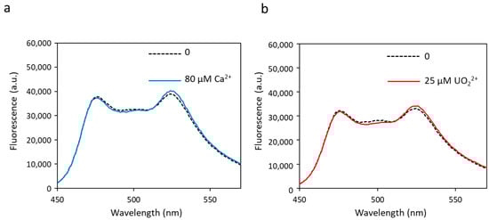 To correct this problem, the eYFP was replaced by a variant of YFP, the Citrine protein, another acceptor FP that is not sensitive to pH and chloride ions [44]. The appropriate mutations were made in biosensor 1, i.e., the change of amino acids 69 and 70 of the eYFP (Val69Leu, Gln70Met) to produce the new construction, called biosensor Cit (Tables S1 and S2). The latter was then tested in the presence of calcium or uranyl. In addition to no longer being sensitive to pH and chloride ions (data not shown), the dynamic response range of biosensor Cit in response to calcium was increased (53% vs. 41%) and that in response to uranyl was almost equivalent to the one measured with biosensor 1 (82% vs. 95%) (Figure 7a, Table 1). The calculated Kd for biosensor Cit were almost equivalent to those for biosensor 1, with a Kd = 6.1 µM for calcium and a Kd = 14.2 nM for uranyl (Table 1).