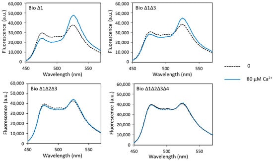 Fluorescence analysis of these different biosensors in the presence of calcium showed calcium-induced FRET changes only with biosensor Δ1 and biosensor Δ1Δ3. For biosensor Δ1, the measured dynamic range was slightly higher than that of biosensor 1 (49% and 41%, respectively). The dynamic range decreased sharply with the increase in the number of sites carrying the ∆2–3 deletion (Figure 4, Table 1). It was only 28% when sites 1 and 3 had the ∆2–3 deletion, fell to 4% when sites 1, 2 and 3 had the ∆2–3 deletion and was almost null (2%) when all four metal-binding loops were mutated. These results show that sites 2, 3 and 4 play a major role in the calcium-dependent FRET variations in the calcium biosensor, in contrast to site 1, which does not seem to be important. Indeed, we have explained above that the presence of the metal-binding site 2 was decisive for the conformational change in the biosensor allowing FRET. Moreover, it is known in the literature that the C-terminal domain of CaM has a better affinity for calcium than the N-terminal domain, i.e., that sites 3 and 4 have a better affinity for calcium than sites 1 and 2 [41]. These results also show that the ∆2–3 deletion suppresses calcium binding not only at site 1, as previously demonstrated [26,27], but also at the other metal-binding sites of CaM.