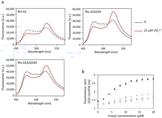 Fluorescence spectra of mutated biosensors with uranyl obtained with an excitation wavelength of 440 nm. (a) Fluorescence measured in arbitrary units (a.u.) with no metal (dashed lines) and 25 µM of uranyl (solid lines). (b) Fluorescence ratios obtained with fluorescence at 525 nm and at 476 nm as a function of the concentration of uranyl with biosensor 1 (●), biosensor ∆1 (●), biosensor ∆1∆2∆3 (●) or biosensor ∆1∆2∆3∆4 (●). Measurements were performed in triplicate, and SD values are represented as error bars.