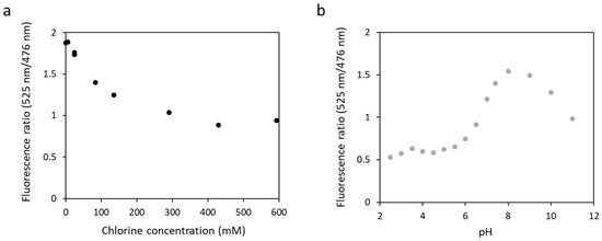 Authors have reported that some yellow fluorescent proteins are sensitive to chloride ions [42] or pH [43], altering the fluorescence properties of the biosensors in the presence of large concentrations in salt. To test this, we measured the fluorescence of biosensor 1 in the presence of an increasing concentration of potassium chloride at pH 7.4 (Figure 6a). The fluorescence ratio decreased from 1.9 to 0.9 with an increase in chloride concentration from 0 to 593 mM. Biosensor 1 was then tested in a wide range of pH, from 2.5 to 11, in the presence of 135 mM potassium chloride (Figure 6b). The results obtained showed that the fluorescence ratio varied with pH. It increased from 0.5 to 1.5 at pH 2.5 to pH 8 and then decreased to 1 at pH 11. These results confirmed those obtained by other teams, showing a sensitivity of the eYFP to chloride ions or pH in our biosensor.