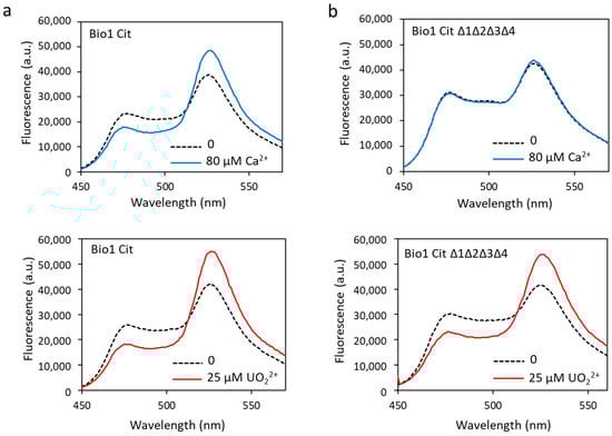 Biosensor Cit (a) and biosensor Cit ∆1∆2∆3∆4 (b) were analyzed in fluorescence with 80 µM of calcium or with 25 µM of uranyl with an excitation wavelength of 440 nm. Fluorescence measured in arbitrary units (a.u.) with no metal (dashed lines) and calcium or uranyl (solid lines).